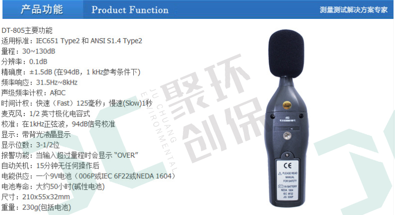 DT-805系列噪聲計(jì)設(shè)計(jì)符合安全工程、健康、工業(yè)安全的測(cè)量要求且能在各種環(huán)境下控制聲音的質(zhì)量。該表符合 IEC651 type 2, ANSI S1.4 type 2標(biāo)準(zhǔn)。