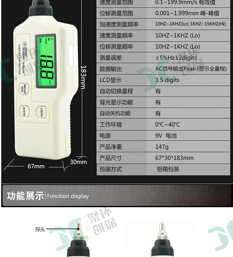 AS63A型:加速度測量范圍:0.1-199.9m/s2峰值、速度測量范圍:0.1-199.9m/s2有效值、位移測量范圍:0.001-1.999mm峰峰值