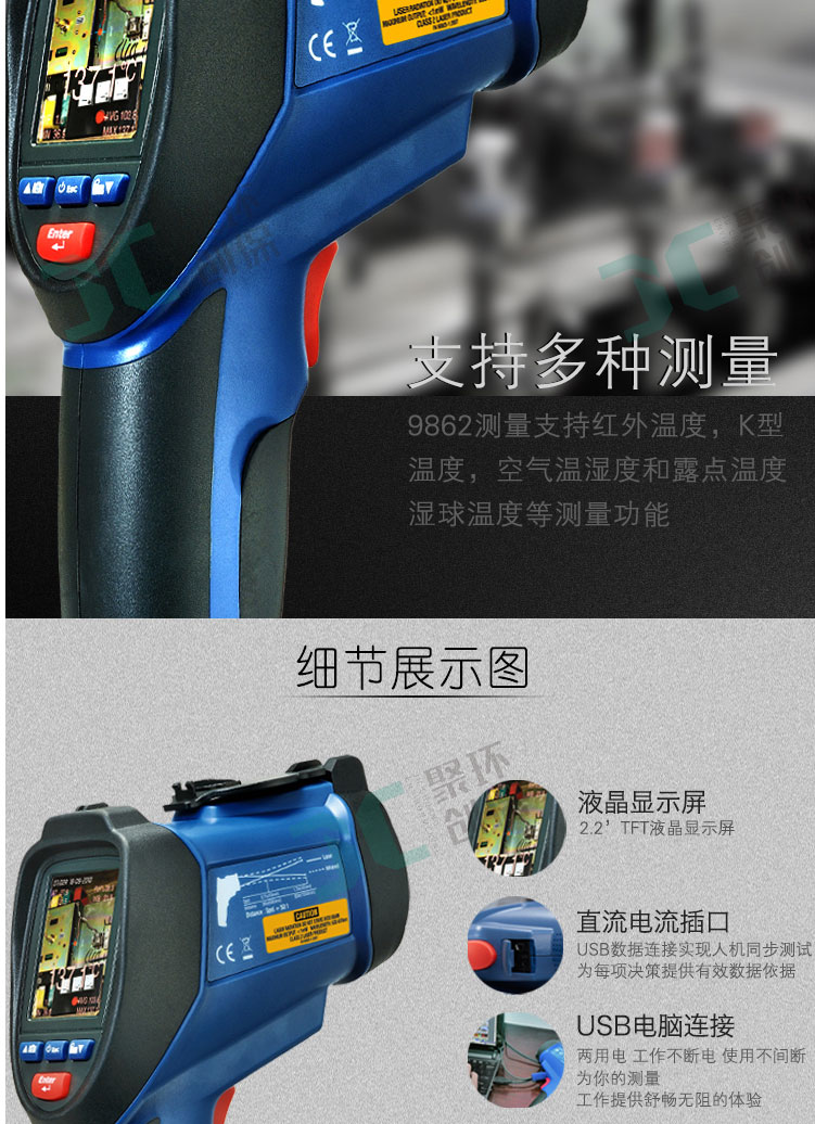 DT-9860是CEM新推出的紅外攝溫儀產(chǎn)品,該產(chǎn)品基于非接觸式紅外測溫儀技術(shù),可測量紅外溫度高達(dá)-50~2200℃,精度高達(dá)±1.5%。該產(chǎn)品獨(dú)創(chuàng)的視頻和照片拍攝功能,并且配備了2.2”彩色TFT液晶屏,可以讓您的工作更直觀和高效。