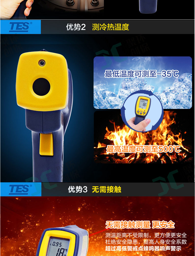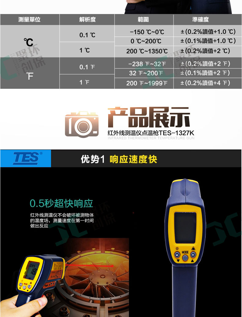 TES-1327K紅外線測溫儀可選擇℃/℉單位 *大值、*小值功能 溫度測量范圍 -20℃~+500℃ 內裝雷射指示光點、背光顯示 距離與目標比 12:1; 25mm*小點尺寸 0.1℃/0.2℉分辨率 固定 0.95。