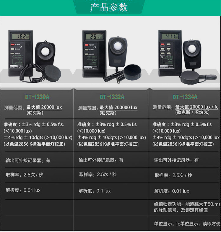 DT系列主要是DT-1300和DT-1301兩個型號,DT-1300照度測量從0.01Lux到50,000Lux,DT-1301測量范圍0~50000 Lux/Fc,四個量程可自行轉換,具有*大值保持和數據保持 功能,具有低電量提示和自動關機功能。
