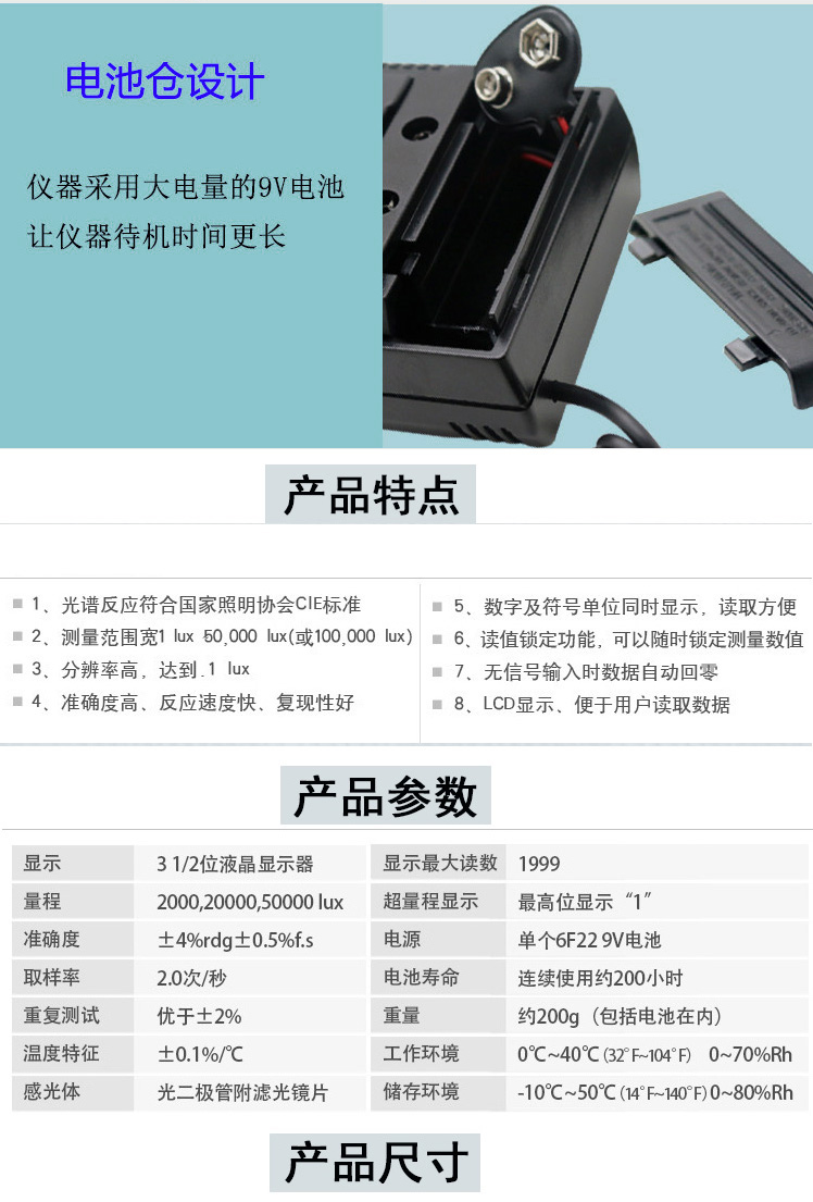 TES-1330A:測量范圍:20/200/2000/20000Lux,量程自動轉換。