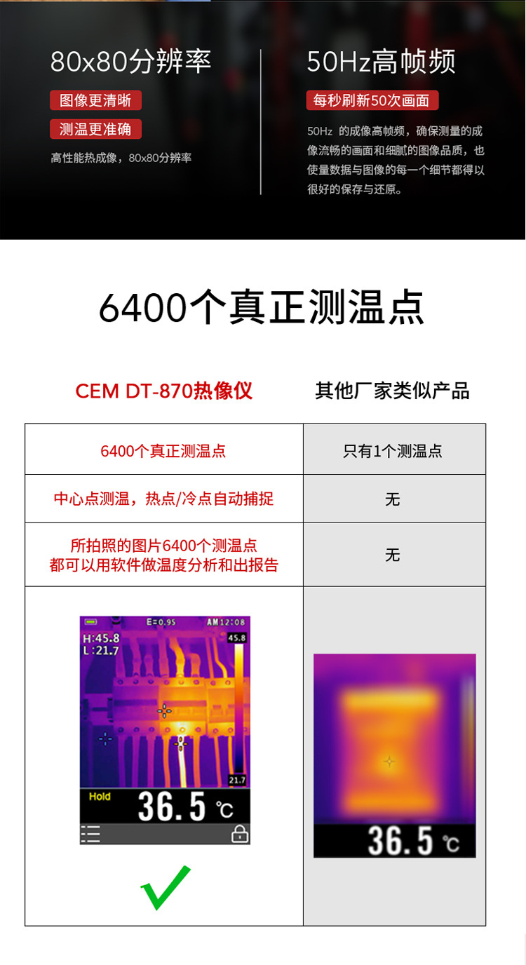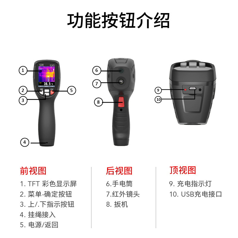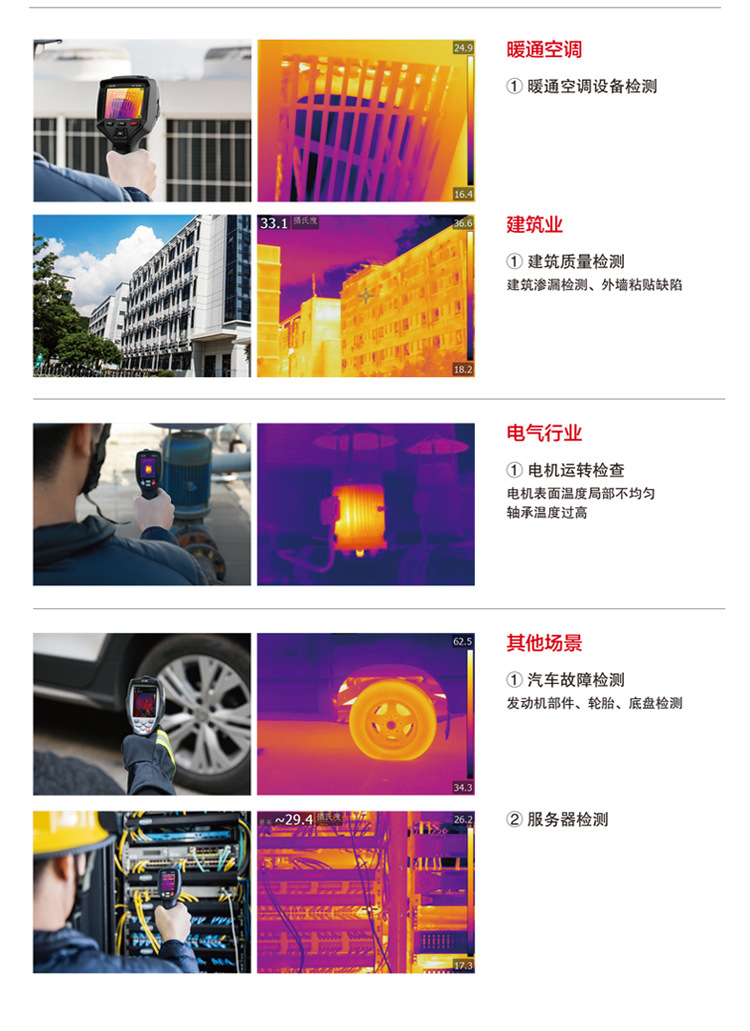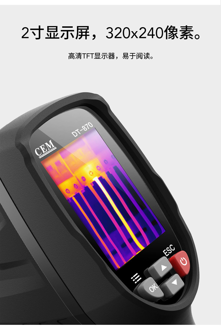 DT-980高精度紅外熱像儀帶有一塊2.8英寸TFT高清觸摸屏,32倍可調焦功能*大限度保證測試清晰度,并可將圖像、視頻和語音存儲在Micro SD卡上(機身附帶4G SD卡,*大可擴展至64G),便于計算機進行濃度分析和統計。可以自動標記區域內*高溫,*低溫及中心點溫度。特別適適合用于建筑物能源效率檢測、電力設備檢測、加工和熱處理等.