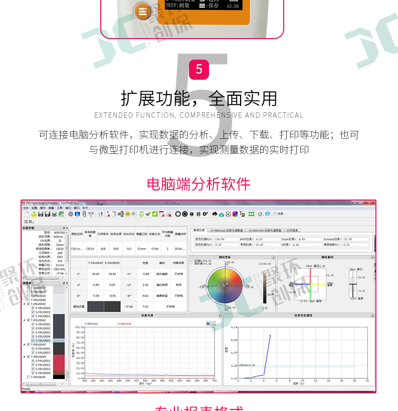 700D型分光測色儀可與電腦端上位機軟件(選配)進行通訊連接,利用電腦端軟件對儀器的功能進行拓展,可實現數據的分析、上傳、下載、打印以及手動輸入LAB值等功能;也可與微型打印機(選配)進行連接,可以實現測量數據的實時打印。
