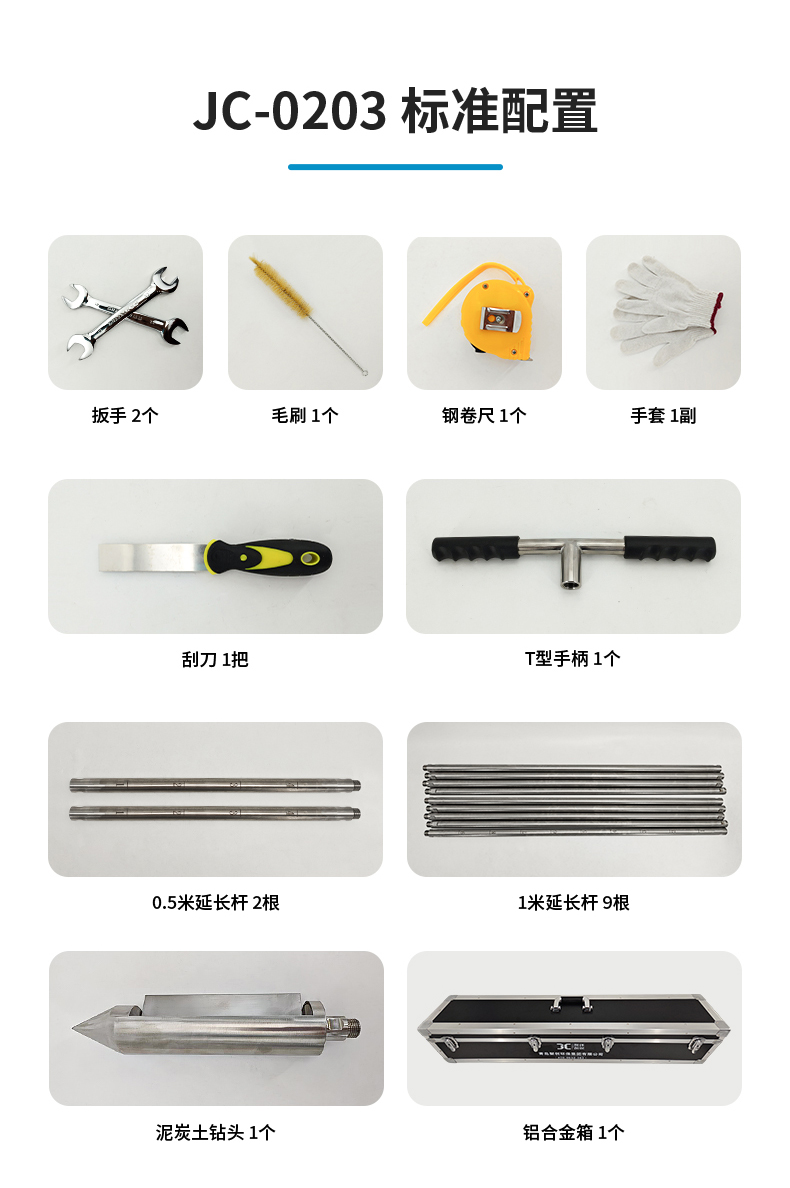 1個(gè)T型手柄、2根0.5米延長(zhǎng)桿、9根1米延長(zhǎng)桿、1個(gè)泥炭鉆頭、1把刮刀、2個(gè)扳手、1個(gè)鋼卷尺、1副手套、1個(gè)毛刷、1個(gè)鋁合金箱