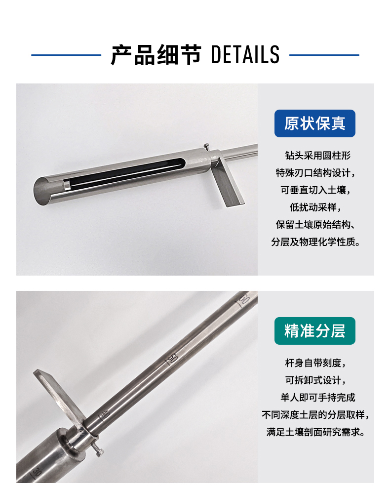 查看詳情(1)鉆頭采用圓柱形特殊刃口結構,可垂直切入土壤,最大程度減少對土壤顆粒排列、孔隙分布和濕度的破壞。