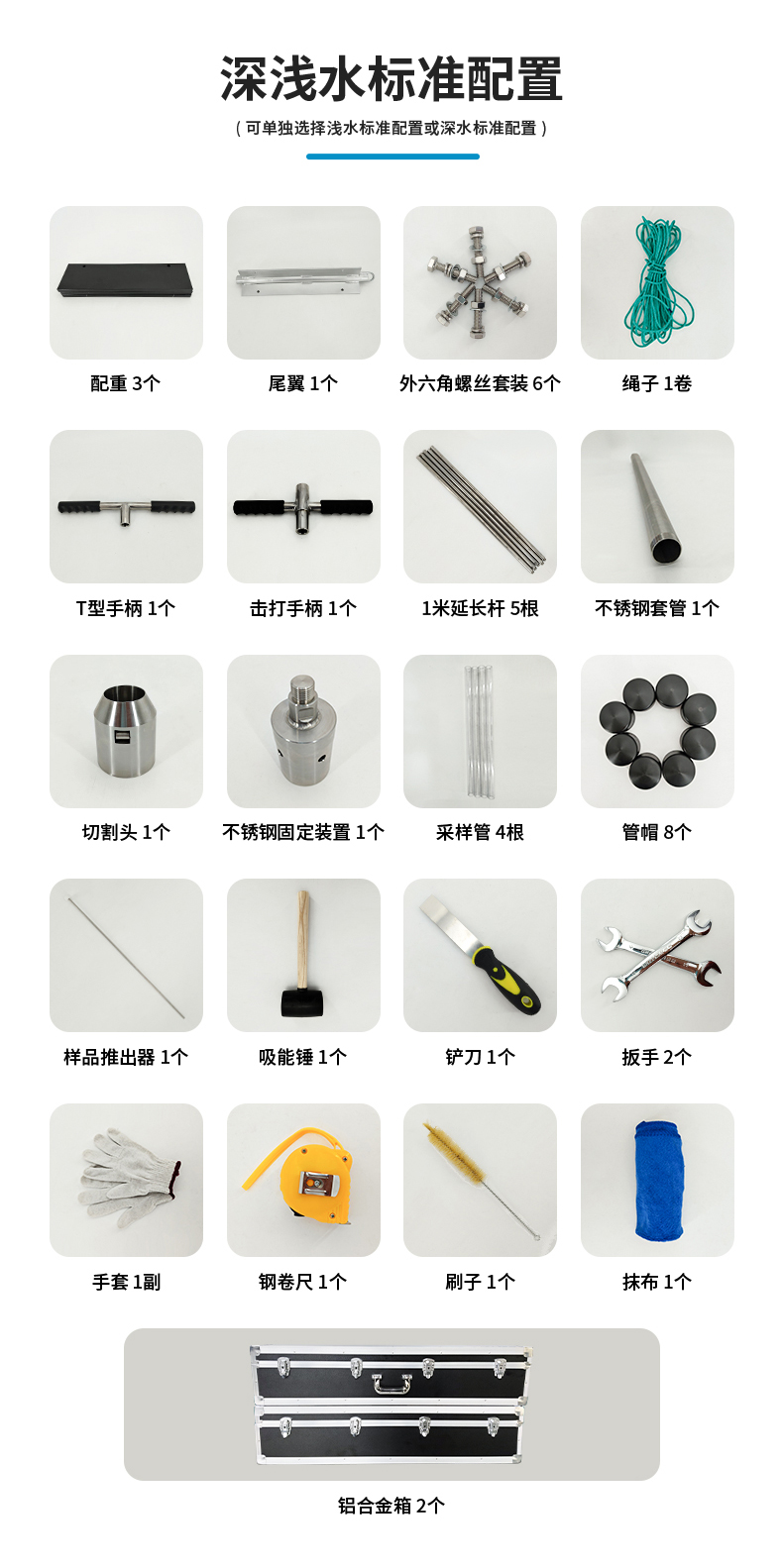 配重×3,尾翼×1,外六角螺絲套裝×6,繩子×1,不銹鋼套管×1,切割頭×1,不銹鋼固定裝置×1,采樣管×4,管帽×8,樣品推出器×1,鏟刀×1,扳手×2,手套×1,鋼卷尺×1,刷子×1,抹布×1,鋁合金箱×1