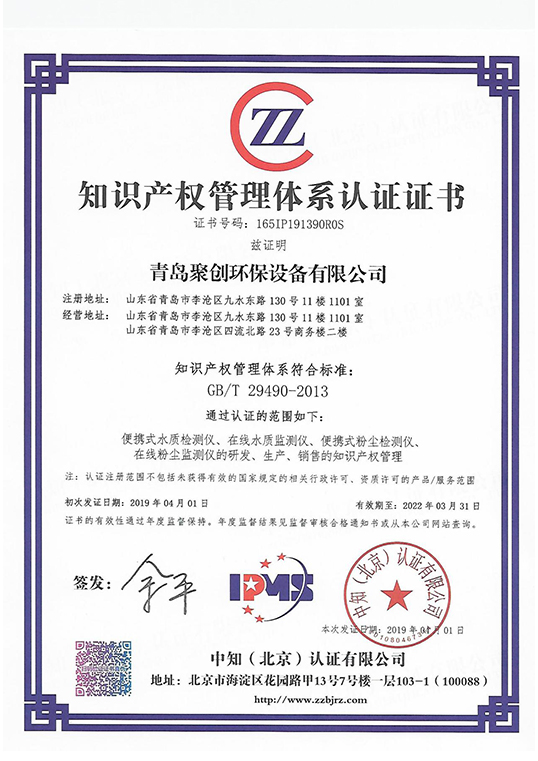近日,青島聚創環保設備有限公司收到了中知(北京)認證有限公司頒發的《知識產權管理體系認證證書》,認證范圍是:便攜式水質檢測儀、在線水質監測儀、便攜式粉塵檢測儀、在線粉塵監測儀的研發、生產和銷售的知識產權管理,這意味著我們在知識產權領域獲得重要認可,在知識產權方面得到進一步規范和在綜合競爭力方面得到進一步提升。