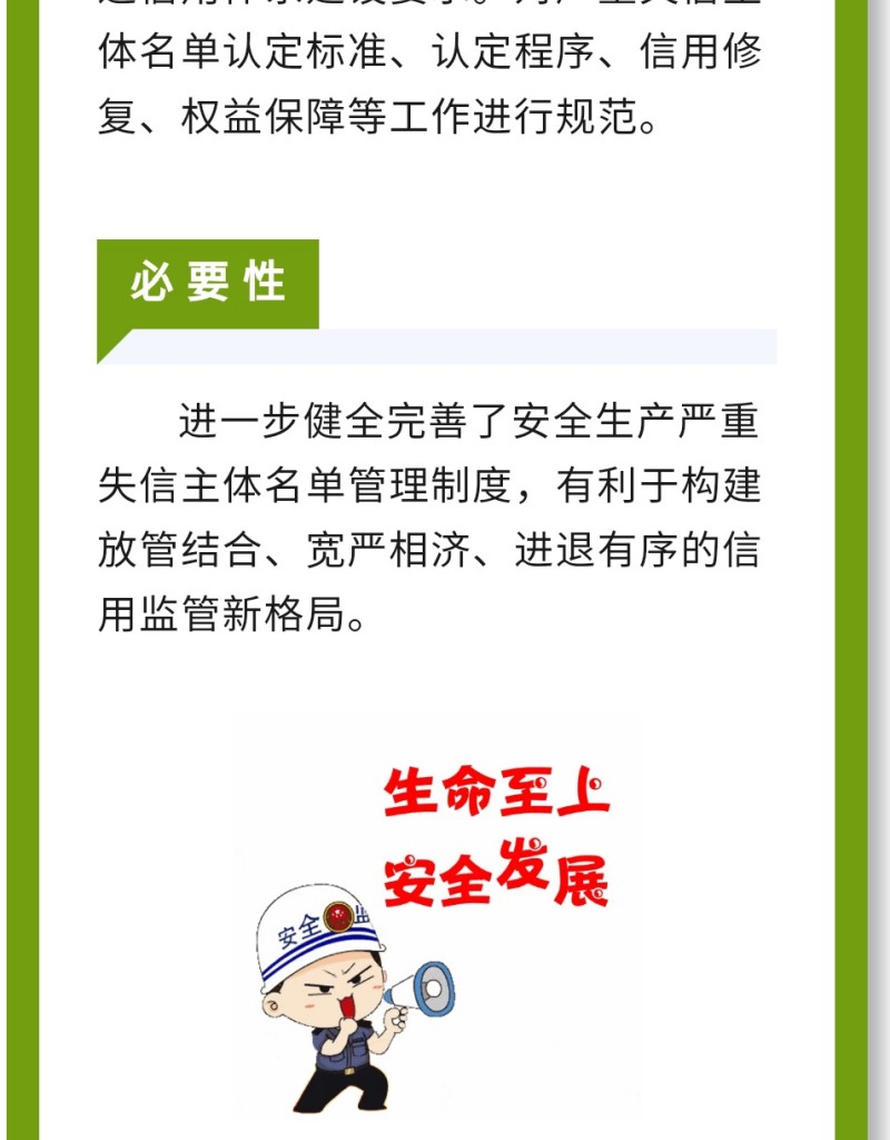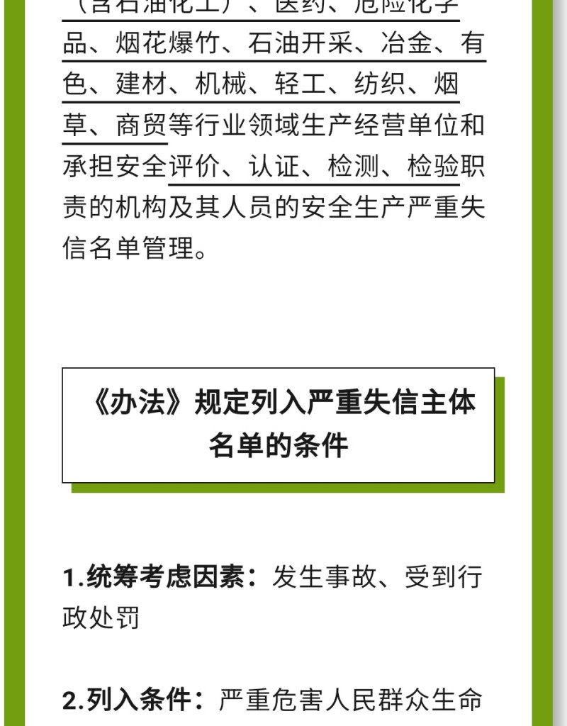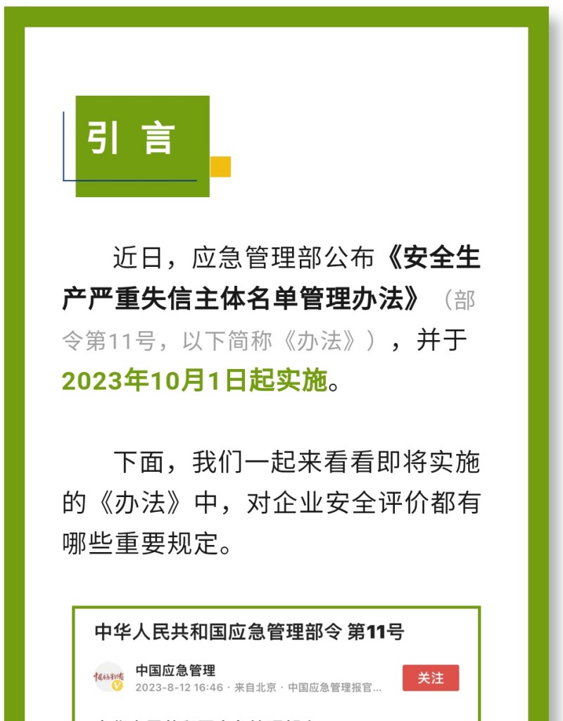 近日,應急管理部公布《安全生產嚴重失信主體名單管理辦法》(部令第11號,以下簡稱《辦法》),并于2023年10月1日起實施。下面,我們一起來看看即將實施的《辦法》中,對企業安全評價都有哪些重要規定。目 的:出臺《辦法》是落實國家關于推進信用體系建設要求。對嚴重失信主體名單認定標準、認定程序、信用修復、權益保障等工作進行規范。必 要 性:進一步健全完善了安全生產嚴重失信主體名單管理制度,有利于構建放管結合、寬嚴相濟、進退有序的信用監管新格局。《辦法》出臺的意義:進一步壓實生產經營單位主體責任,通過監管機制創新助力安全生產監管能力提升。 《辦法》制定的基本原則√依法依規√保護權益√審慎適度√清單管理《辦法》規定列入嚴重失信主體名單的領域是什么?聚焦礦山(含尾礦庫)、化工(含石油化工)、醫藥、危險化學品、煙花爆竹、石油開采、冶金、有色、建材、機械、輕工、紡織、煙草、商貿等行業領域生產經營單位和承擔安全評價、認證、檢測、檢驗職責的機構及其人員的安全生產嚴重失信名單管理。《辦法》規定列入嚴重失信主體名單的條件1.統籌考慮因素:發生事故、受到行政處罰。2.列入條件:嚴重危害人民群眾生命安全、拒不履行法定義務等性質惡劣、情節嚴重的失信行為列入名單,對企業有哪些影響?第八條 應急管理部門對被列入嚴重失信主體名單的對象(以下簡稱被列入對象)可以采取下列管理措施: (一)在國家有關信用信息共享平臺、國家企業信用信息公示系統和部門政府網站等公示相關信息; (二)加大執法檢查頻次、暫停項目審批、實施行業或者職業禁入; (三)不適用告知承諾制等基于誠信的管理措施; (四)取消參加應急管理部門組織的評先評優資格; (五)在政府資金項目申請、財政支持等方面予以限制; (六)法律、行政法規和黨中央、國務院政策文件規定的其他管理措施。聚創環保,提供一站式檢測儀器的行業配套方案,可為行業客戶提供有效的大數據支持,并且可根據客戶需求提供采購配套方案。您還有哪些儀器檢測方面的問題亟需解決,或是希望了解哪些行業的檢測配套方案~