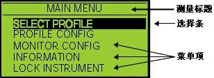 當處于測量模式的時候,按儀器MENU鍵,進入主菜單。主菜單顯示出來時按MENU鍵將返回到測量儀器的測量模式。在主菜單顯示狀態可以通過使用“↑↓”鍵來移動選擇項。按OK鍵確定將激活所選擇的項目。