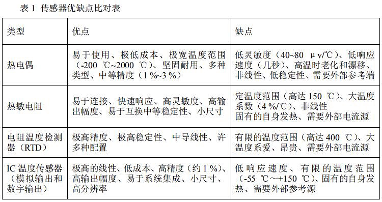 溫度傳感器有四種主要類型:熱電偶、熱敏電阻、電阻溫度檢測器(RTD)和 IC 溫度傳感器(模擬輸出和數(shù)字輸出)。本研究根據(jù)傳感器測量原理、適用范圍,同時充分考慮市場應(yīng)用情況,選取溫度傳感器。