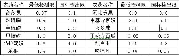 通過大量標準品對照實驗,確定試劑的低檢出限,農藥殘留快速檢測試劑對幾種常見農藥的低檢測限及國標要求檢出限如下表: 單位(mg/kg)