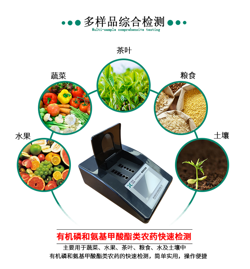 農藥殘留檢測儀是依據國家標準方法GB/T 5009.199-2003《蔬菜中有機磷和氨基甲酸酯類農藥殘留量的快速檢測》而設計的快速檢測儀器。主要用于蔬菜、水果、茶葉、糧食、水及土壤中有機磷和氨基甲酸酯類農藥的快速檢測。儀器簡單實用,操作便捷。適用于小型農貿批發銷售市場、農產品采購配送中心、酒樓、食堂、家庭果蔬加工前安全檢測。