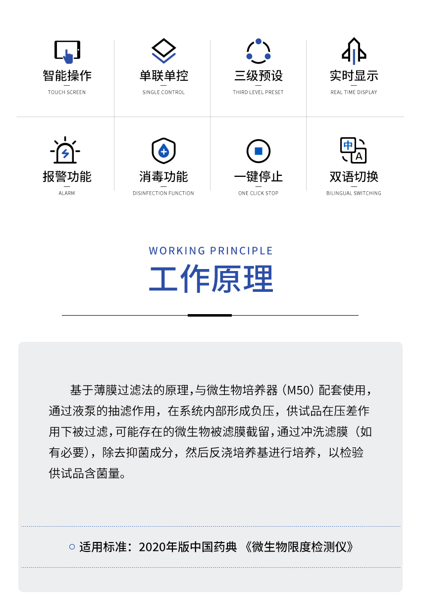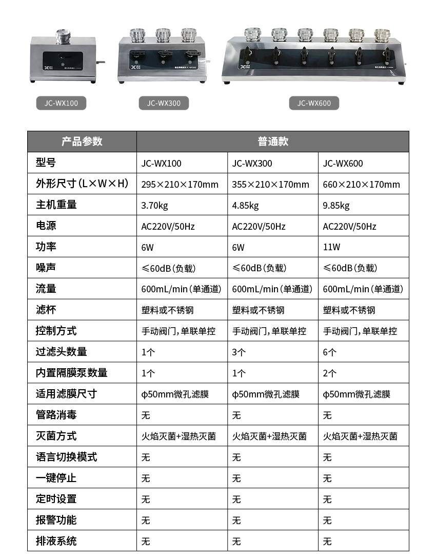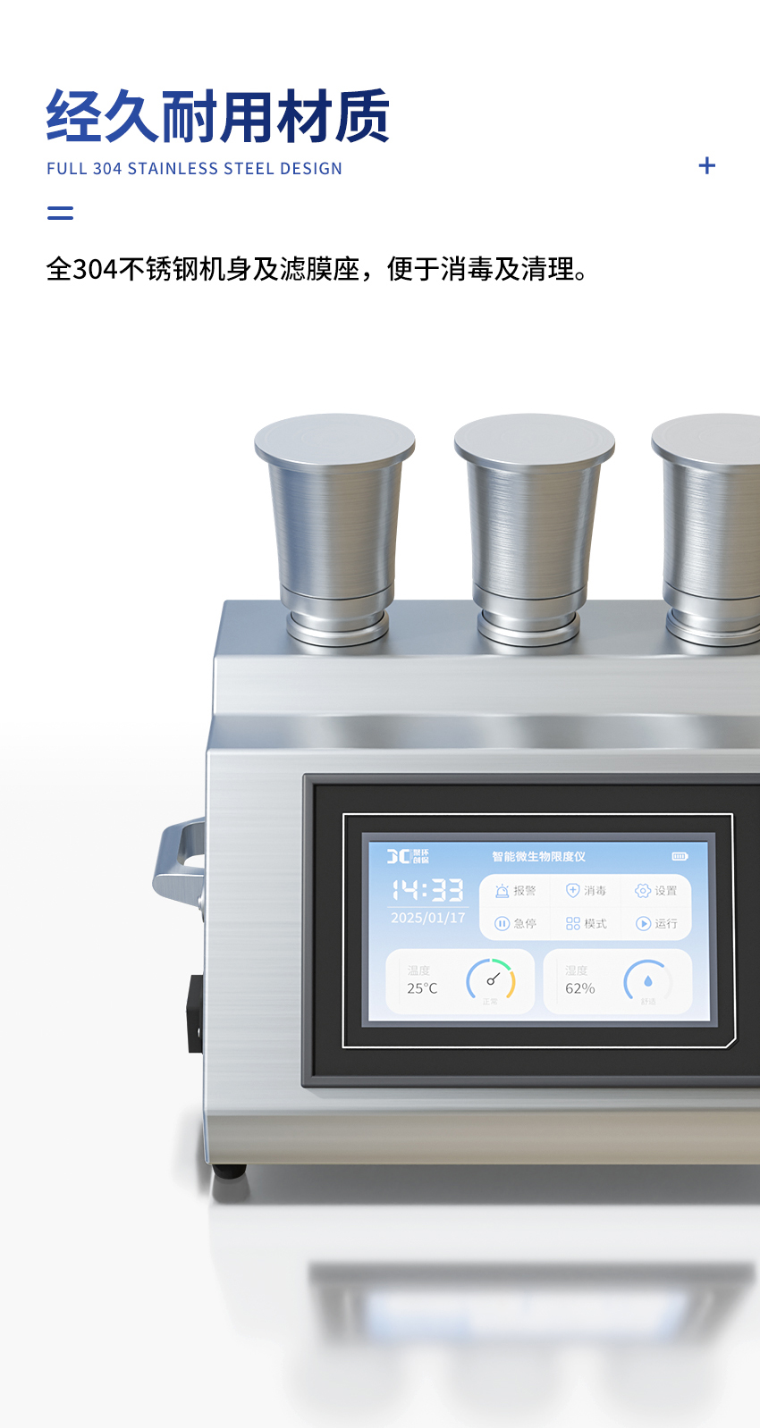 聚創智能三聯微生物限度儀JC-WX300C基于薄膜過濾法的原理,與微生物培養器(M50)配套使用,通過液泵的抽濾作用,在系統內部形成負壓,供試品在壓差作用下被過濾,可能存在的微生物被濾膜截留,通過沖洗濾膜(如有必要),除去抑菌成分,然后反澆培養基進行培養,已檢驗供試品含菌量。主要用于各類水質、藥品、食品等介質中微生物檢測及實驗室中進行除菌、除微粒等。具有操作過程不易受到污染、易于清潔等特點。