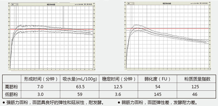 定量小麥粉加適量水揉和,由計算機系統繪制攪拌阻力隨時間變化的坐標圖即粉質曲線,從加水量和記錄攪拌性能的粉質曲線計算小麥粉吸水量及評價面團攪拌時的形成時間、穩定時間、弱化度等特性,用以評價面粉筋力強度。