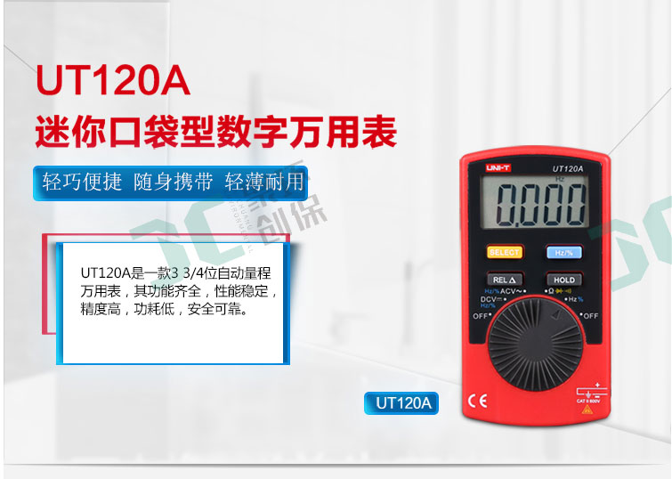 UT120系列是一款可隨身攜帶、小巧、輕便的3 3/4位自動量程口袋型數字萬用表,其功能齊全,性能穩定,精度高,功耗低,結構新穎,安全可靠,操作簡單,好用、耐磨、耐用,是廣大用戶的理想測量儀表。可用于家庭、學校、冶煉、通訊、制造、石油、電力、化工等領域,是電路/電力設備維護和維修的理想工具。
