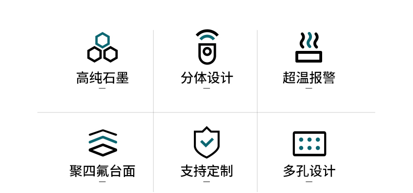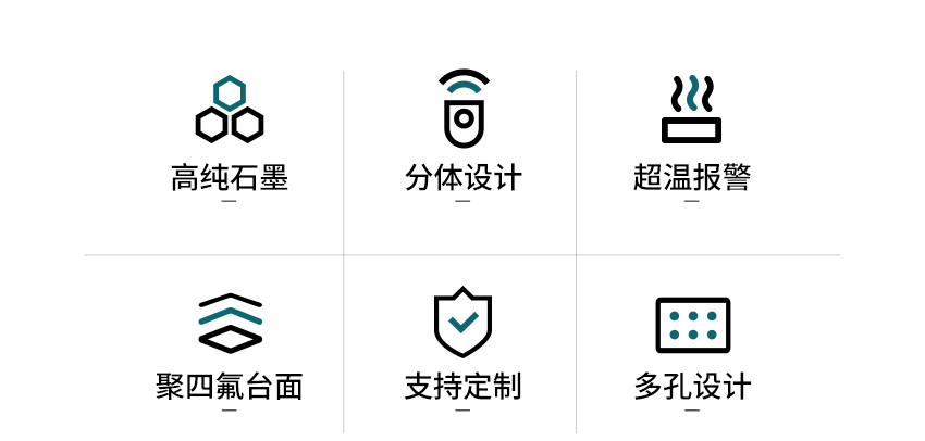 - 石墨體表面噴涂特氟龍涂層,使其具備易清潔、耐腐蝕的特性。