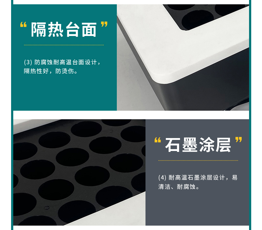 - 聚四氟乙烯臺面,不僅不易被腐蝕,還具有良好的隔熱性,能有效防止燙傷,可在強酸強堿等惡劣環境中放心使用。