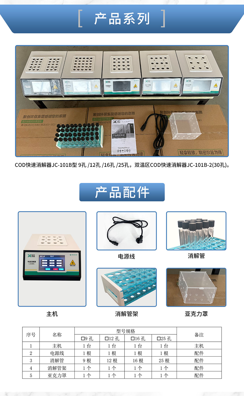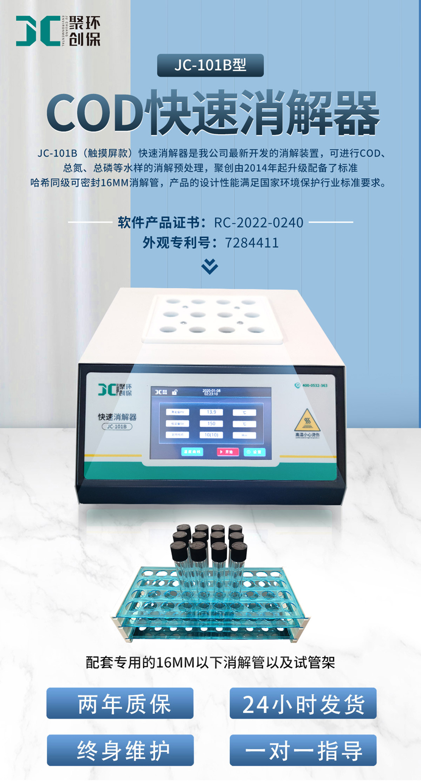 JC - 101B型COD快速消解儀是一種用于快速測定化學耗氧量的加熱裝置,可對COD、總磷、總氮等樣品進行消解預處理。