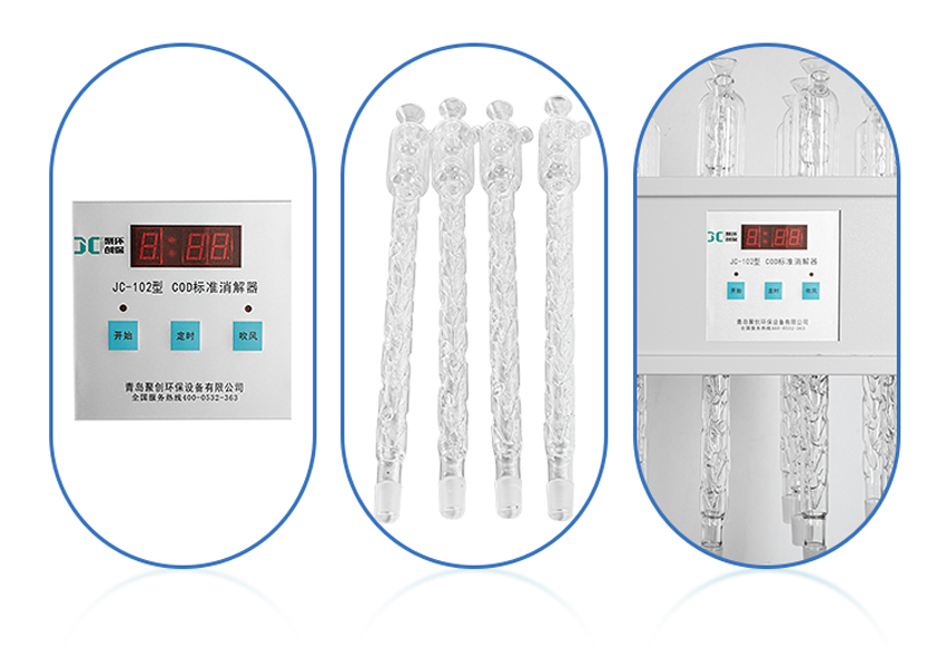 JC-102型標準COD消解器采用微機技術進行定時控制加熱電爐,可對8個250ml錐形消解回流裝置同時進行加熱。達到節能、減低電力負荷、節水、提高 效率的目的。
