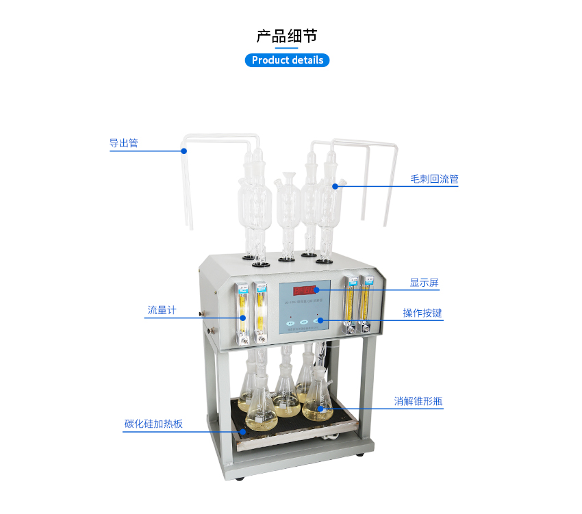 COD消解器是測定COD指標時對水樣前處理的一款加熱裝置,其本身是不具有測定功能,該系列產品遵循國際標準(ISO)和國家標準(GB11914-89)的基本原則,保證其消解操作,試劑溶液的配置加入量都和國標法一致,確保可靠準確的分析結果,化學需氧量越大,說明水體受有機物的污染越嚴重。
