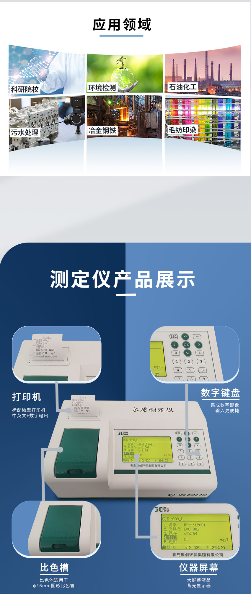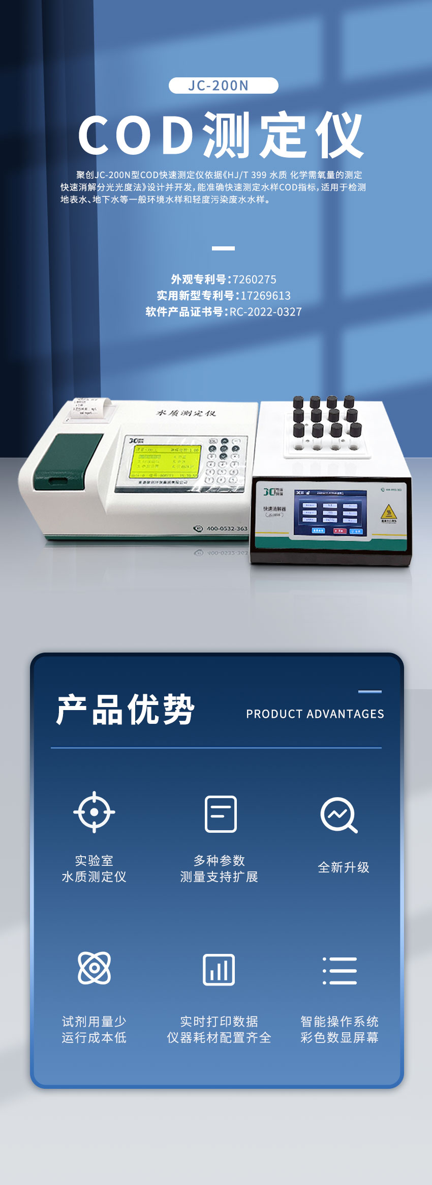聚創JC-200N型COD快速測定儀依據《HJ/T 399 水質 化學需氧量的測定 快速消解分光光度法》設計并開發,能準確快速測定水樣的COD指標,適用于檢測地表水、地下水等一般環境水樣和中輕度污染廢水水樣。可廣泛應用于環保監測站、污水處理廠、大專院校、科研院所、石化、造紙、印染、電子、電力、鋼鐵、農業、市政工程等行業。