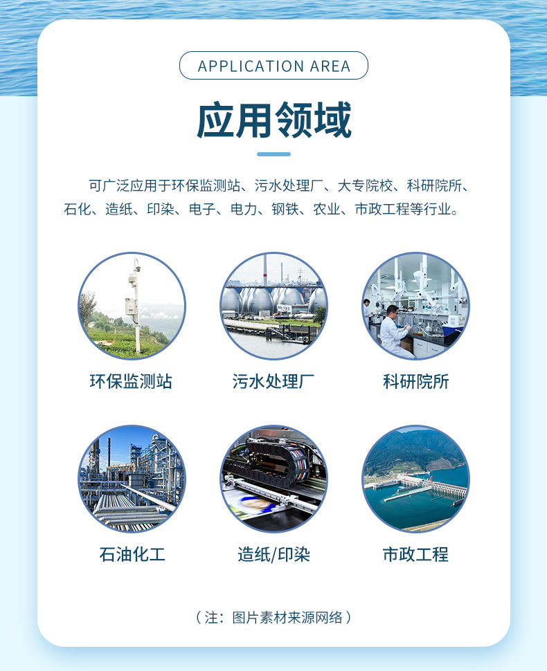 可廣泛應用于環保監測站、污水處理廠、大專院校、科研院所、石化、造紙、印染、電子、電力、鋼鐵、農業、市政工程等行業。
