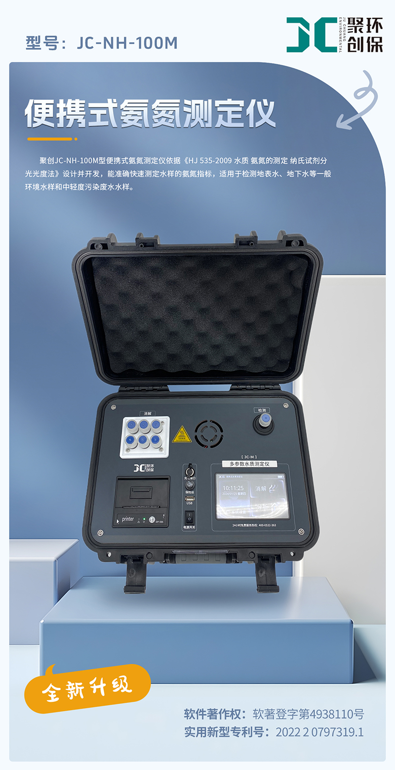聚創JC - NH - 100M型便攜式氨氮測定儀依據《HJ 535 水質 氨氮的測定 納氏試劑分光光度法》設計開發,能夠準確快速地測定水樣的氨氮指標。該儀器適用于檢測地表水、地下水等一般環境水樣以及中輕度污染廢水水樣,廣泛應用于環保監測站、污水處理廠、大專院校、科研院所、石化、造紙、印染、電子、電力、鋼鐵、農業、市政工程等行業。