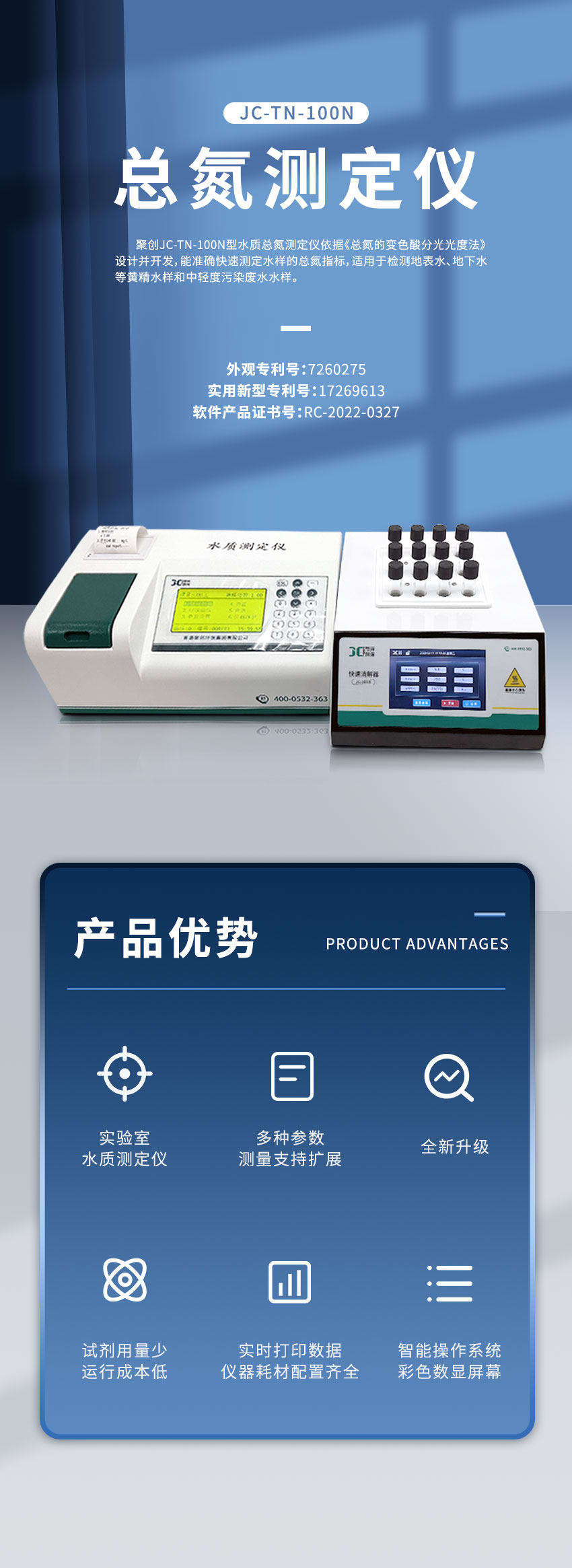 聚創JC-TN-100N型水質多參數測定儀依據《總氮的變色酸分光光度法》設計并開發,能準確快速測定水樣的總氮指標,適用于檢測地表水、地下水等一般環境水樣和中輕度污染廢水水樣??蓮V泛應用于環保監測站、污水處理廠、大專院校、科研院所、石化、造紙、印染、電子、電力、鋼鐵、農業、市政工程等行業。