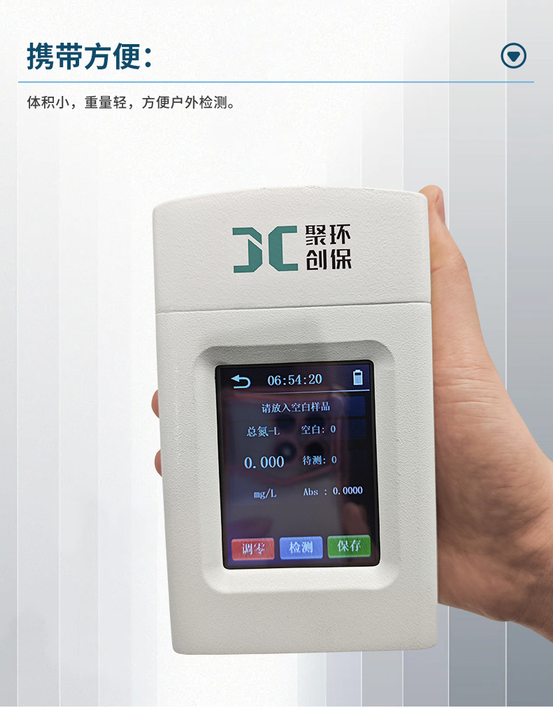 聚創JC-TN-100K型手持式總氮測定儀采用輕量化外殼及人性化程序設計,能快速準確地測量水中的總氮指標,適用于檢測地表水、地下水等一般環境水樣和中輕度污染廢水水樣。