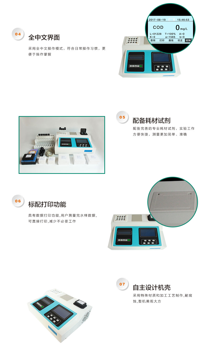 JC-501D型COD氨氮總磷總氮濁度五參數水質檢測儀將經典的比色法與先進的計算機技術結合起來,應用微電腦光電子比色檢測原理取代傳統的目視比色法,消除了人為誤差,測量分辨率大大提高。該產品具有自動PID控溫、雙液晶顯示、自動調零、濃度直讀、曲線存儲、自動打印等特點,儀器操作簡便,人機交互式操作,使用者無需復雜的專業知識即可應用本產品。