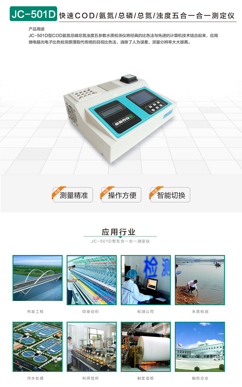 (4)五合一檢測儀:JC-501A、JC-501B、JC-501C、JC-501D型四合一檢測儀可以檢測COD、氨氮、總磷、總氮、濁度
