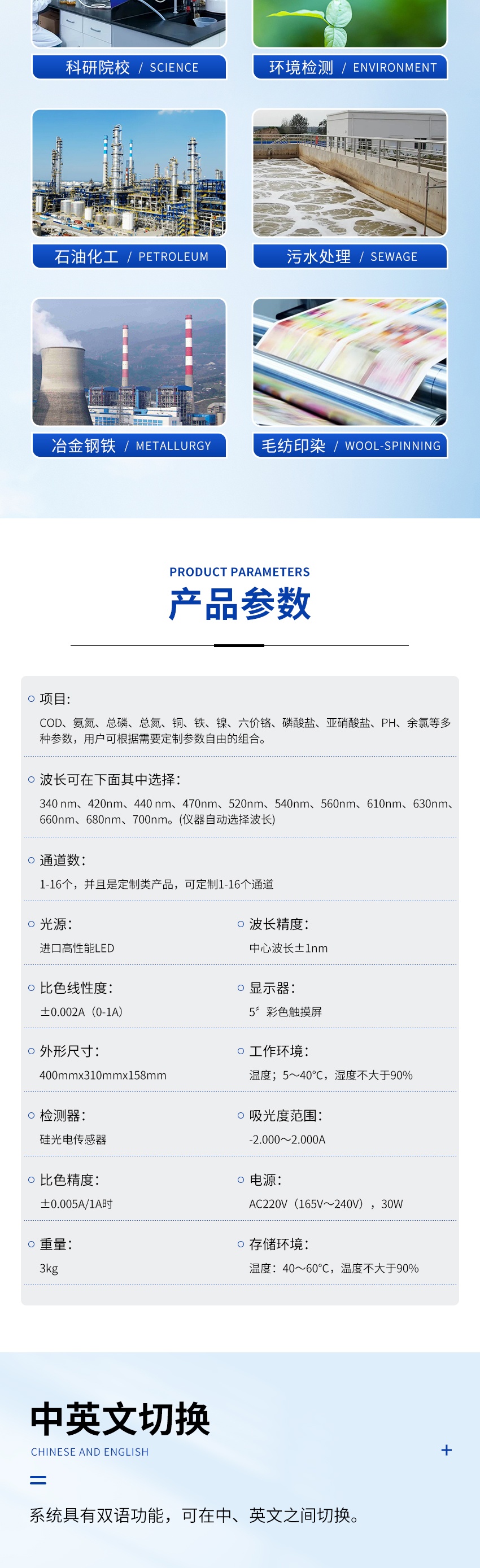 1、項目:COD、氨氮、總磷、總氮、銅、鐵、鎳、六價鉻、磷酸鹽、亞硝酸鹽、PH、余氯等多種參數,用戶可根據需要定制參數自由的組合。
