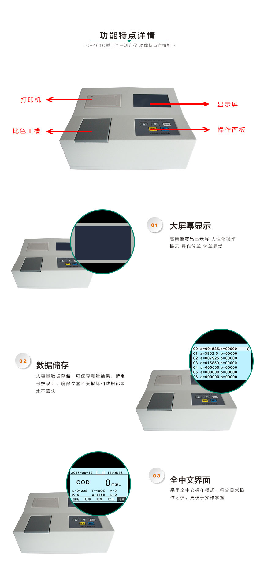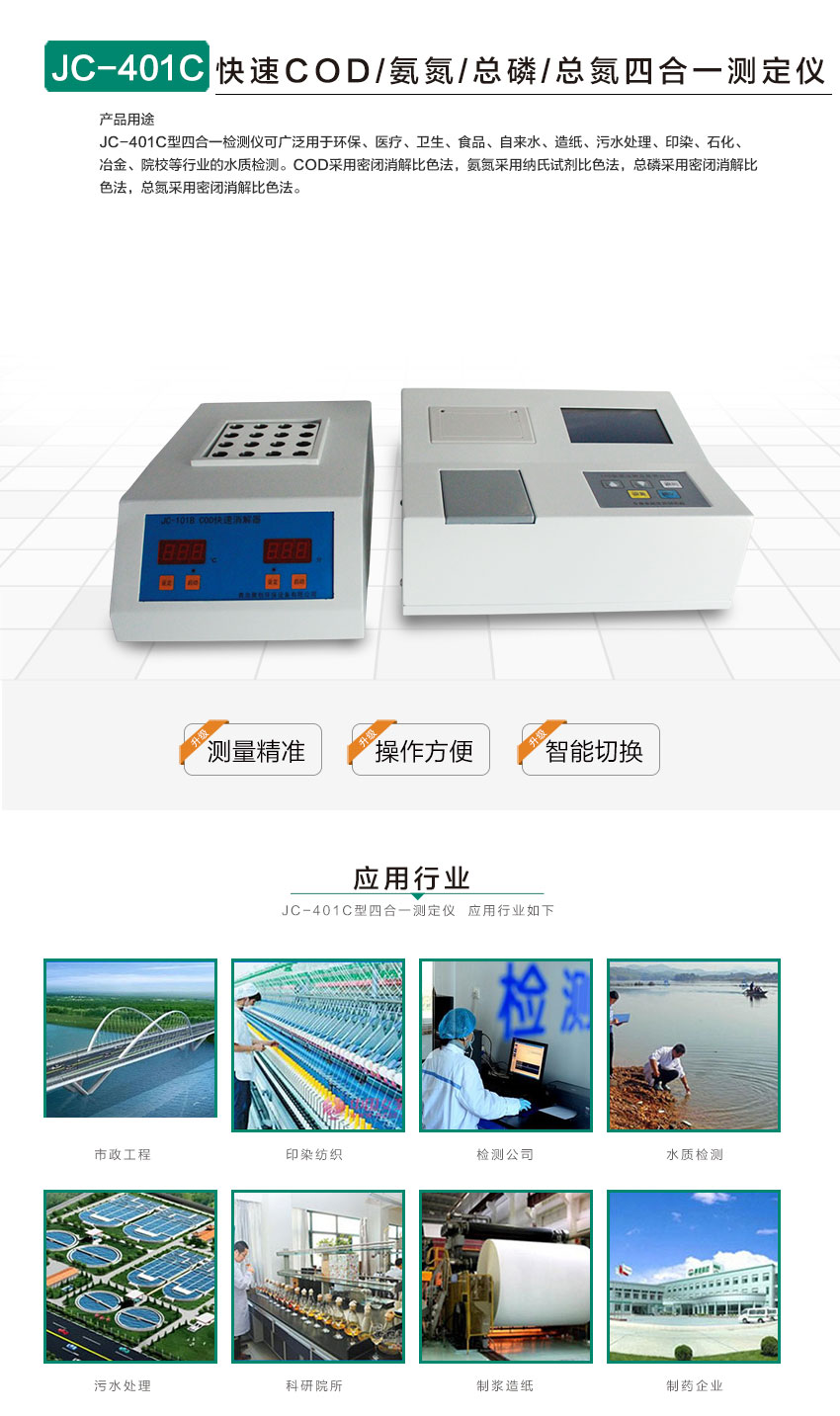(3)四合一檢測儀:JC-401A、JC-401B、JC-401C、JC-401D型四合一檢測儀可以檢測COD、氨氮、總磷、總氮四項指標