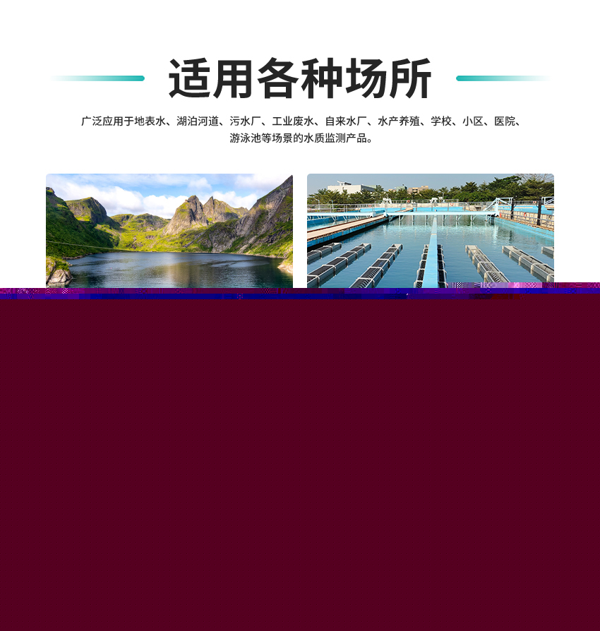 廣泛應用于地表水、湖泊河道、污水廠、工業廢水、自來水廠、水產養殖、學校、小區、醫院、游泳池等場景的水質監測。