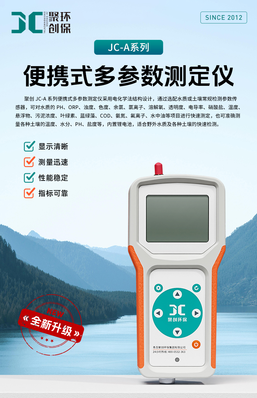 聚創JC-A系列便攜式多參數測定儀采用電化學法結構設計,通過選配水質或土壤常規檢測參數傳感器,可對水質的PH、ORP、濁度、色度、余氯、氯離子、溶解氧、透明度、電導率、硝酸鹽、溫度、懸浮物、污泥濃度、葉綠素、藍綠藻、COD、氨氮、氟離子、水中油等項目進行快速測定,也可準確測量各種土壤的溫度、水分、PH、鹽度等,內置鋰電池,適合野外水質及各種土壤的快速檢測。