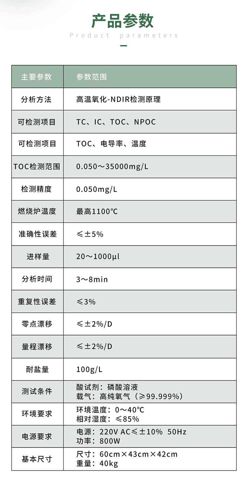 TOC檢測范圍 0.050~35000mg/L
