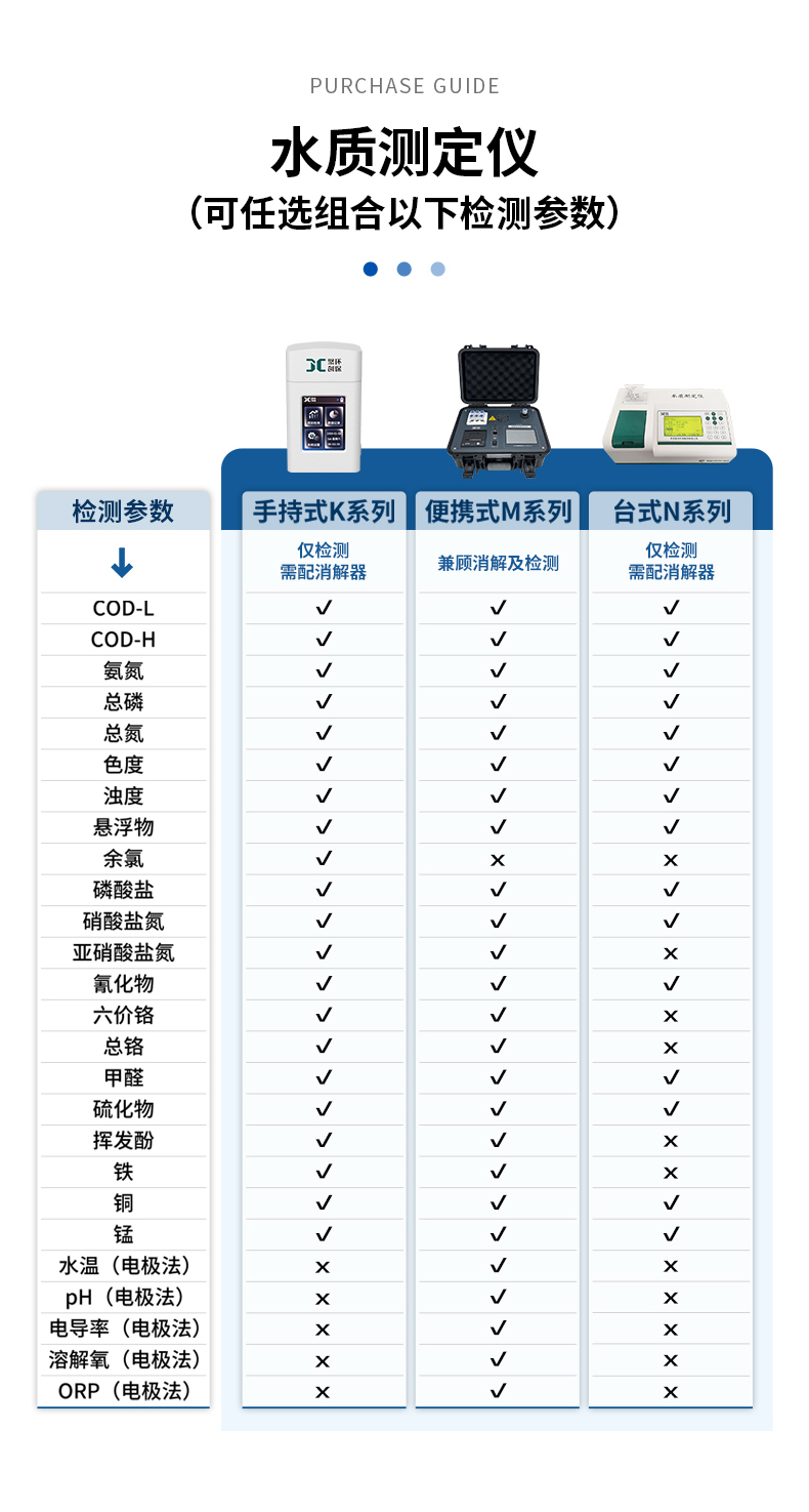 1、聚創K系列、M系列及N系列水質測定儀都可以用于檢測COD、氨氮、總磷、總氮,也可根據用戶需求定制添加色度、懸浮物等更多參數,詳情可咨詢客服。