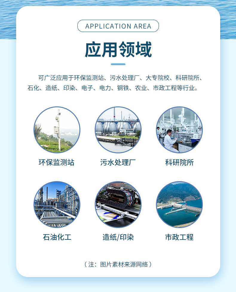 可廣泛應用于環保監測站、污水處理廠、大專院校、科研院所、石化、造紙、印染、電子、電力、鋼鐵、農業、市政工程等行業。