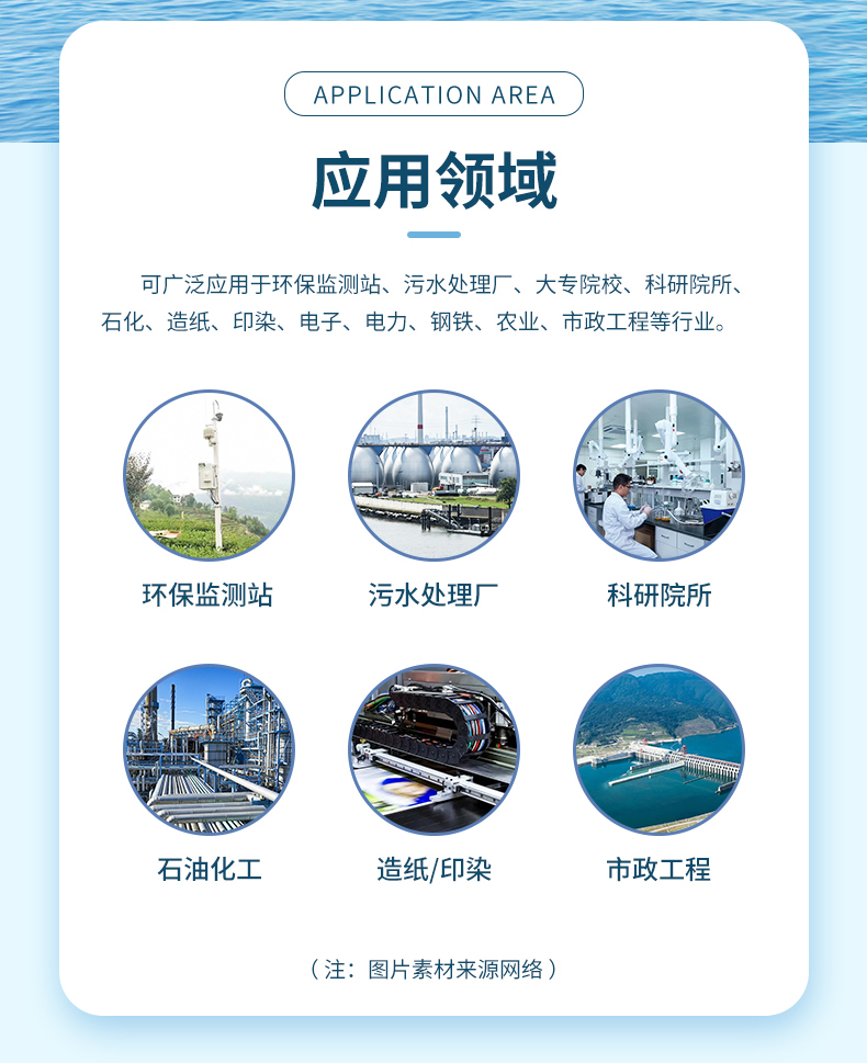 可廣泛應(yīng)用于環(huán)保監(jiān)測(cè)站、污水處理廠、大專院校、科研院所、石化、造紙、印染、電子、電力、鋼鐵、農(nóng)業(yè)、市政工程等行業(yè)。