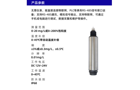 溶解氧傳感器采用熒光法測量溶解氧,傳感器頂端覆蓋了一層熒光物質,當傳感器發出的藍光照射到熒光物質時,熒光物質受到激發發出紅光,由于氧分子可以帶走能量(猝熄效應),所以激發的紅光的時間和強度與氧分子的濃度成反比,通過計算可得出水中溶解氧的濃度。該產品普遍應用于污水處理廠調節池、生化池、出水等各工藝過程的DO在線監測;自來水廠、地表水、各種工業生產過程用水、水產養殖等行業的DO在線監測。