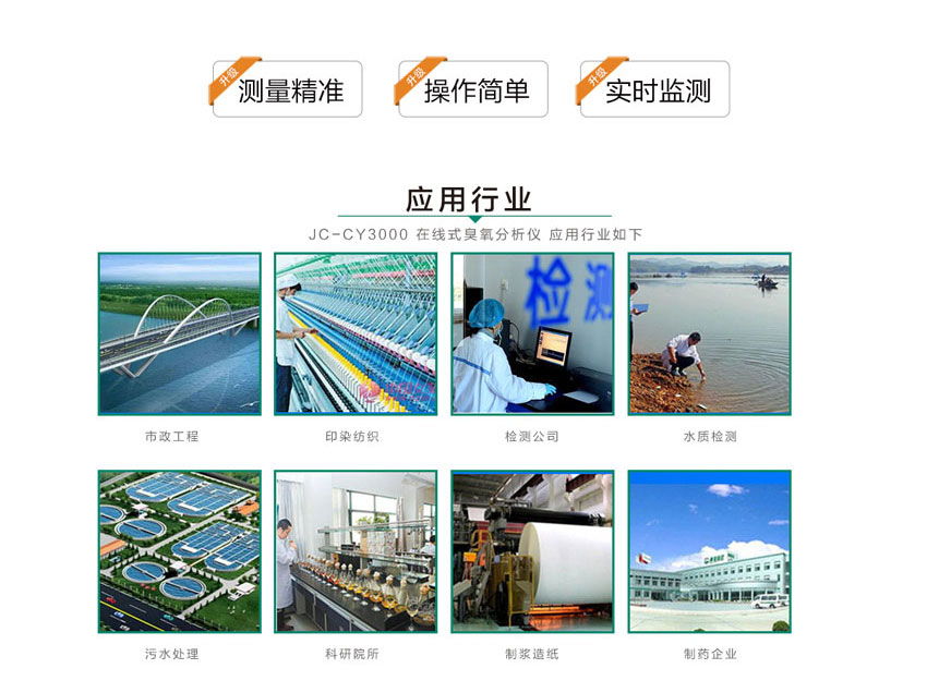用于飲用水處理廠、罐裝廠、飲用水分布網、游泳池、冷卻循環水、水質處理工程等對水溶液中的臭氧含量進行連續監測和控制。