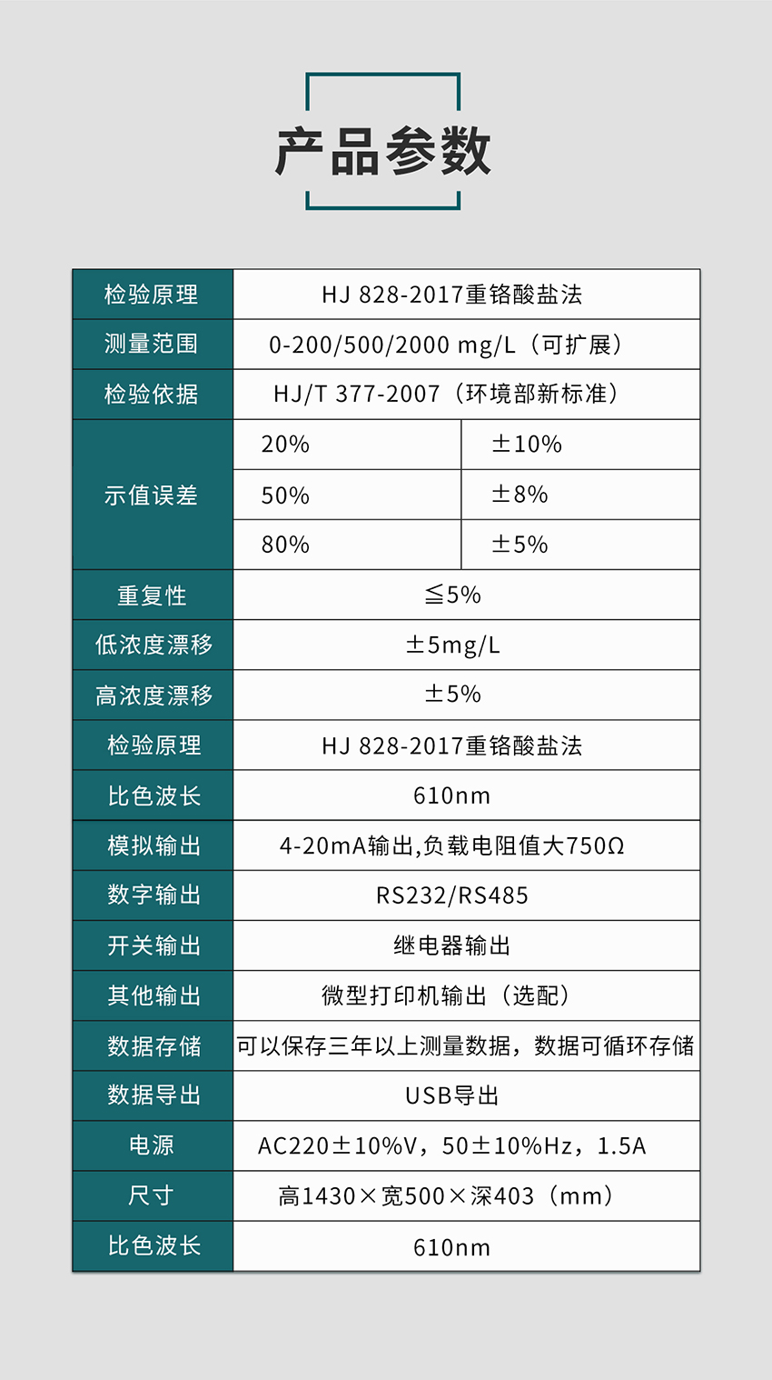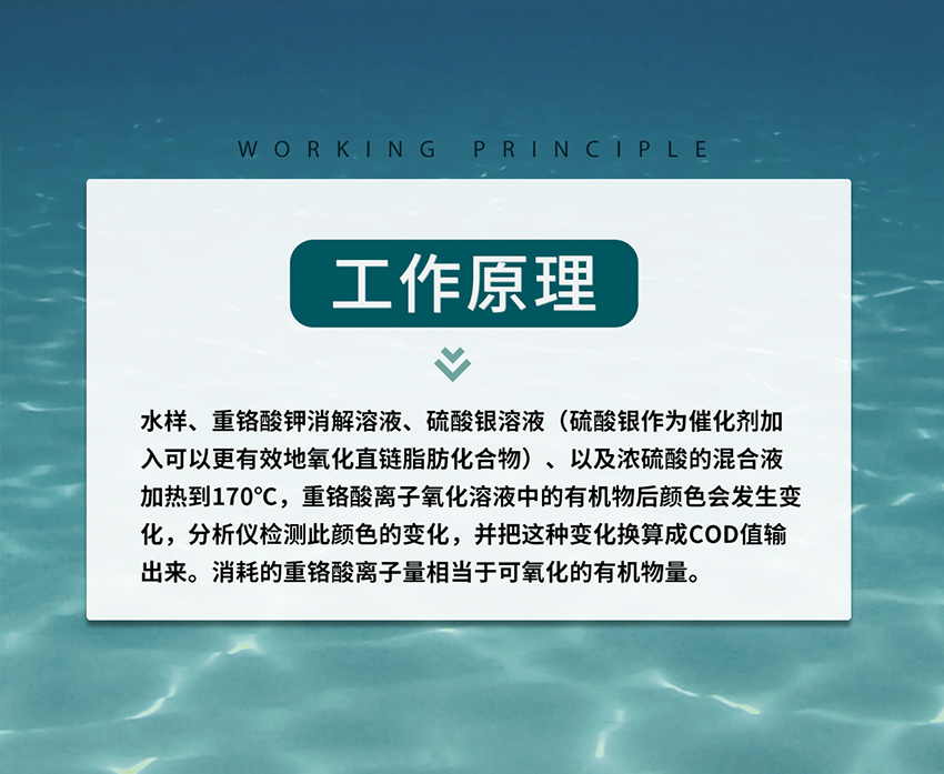 基本原理:水樣、重鉻酸鉀消解溶液、硫酸銀溶液(硫酸銀作為催化劑加入可以更有效地氧化直鏈脂肪化合物)、以及濃硫酸的混合液加熱到170℃,重鉻酸離子氧化溶液中的有機物后顏色會發生變化,分析儀檢測此顏色的變化,并把這種變化換算成COD值輸出來。消耗的重鉻酸離子量相當于可氧化的有機物量。