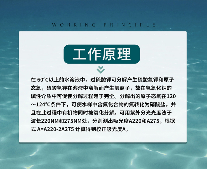 工作原理:在 60℃以上的水溶液中,過硫酸鉀可分解產生硫酸氫鉀和原子態(tài)氧,硫酸氫鉀在溶液中離解而產生氫離子,故在氫氧化鈉的堿性介質中可促使分解過程趨于完全。分解出的原子態(tài)氧在120~124℃條件下,可使水樣中含氮化合物的氮轉化為硝酸鹽,并且在此過程中有機物同時被氧化分解。可用紫外分光光度法于波長220nm和275nm處,分別測出吸光度A220和A275,根據式 A=A220-2A275 計算得到校正吸光度A。