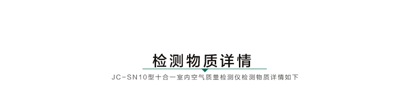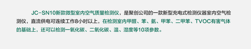 JC-SN10新款微型室內空氣質量檢測儀,是聚創公司的一款新型室內空氣檢測儀,是目前國內較少的一款充電式檢測儀器,其內置大容量鎳氫電池,交、直流兩用供電方式,直流供電可連續工作8小時以上,在檢測室內甲醛、苯、氨、甲苯、二甲苯、TVOC有害氣體的基礎上,還可以檢測一氧化碳、二氧化碳、溫、濕度等10項參數,是目前國內較少的一款十合一產品。