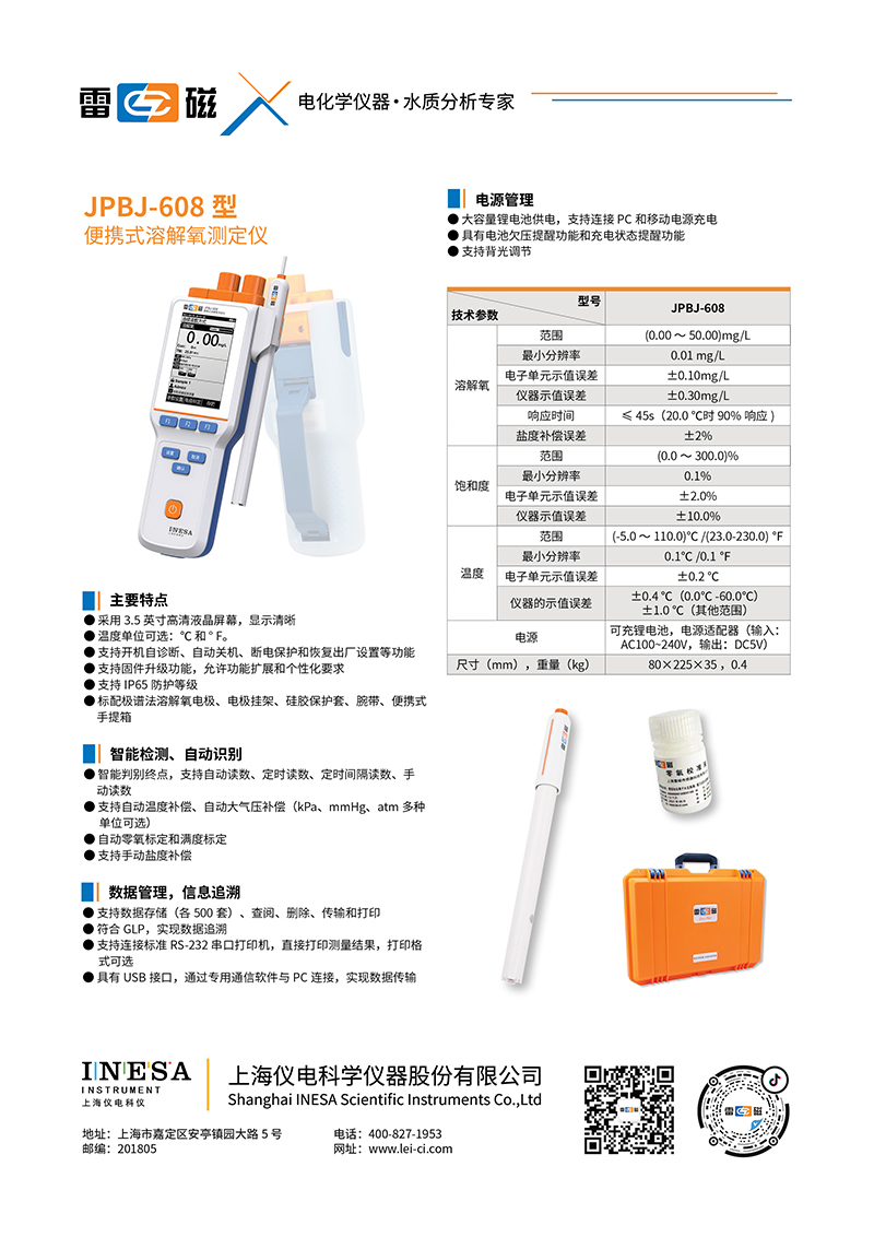 (5)JPBJ-608:探頭測定,自動溫補,可以顯示濃度、飽和度、溫度