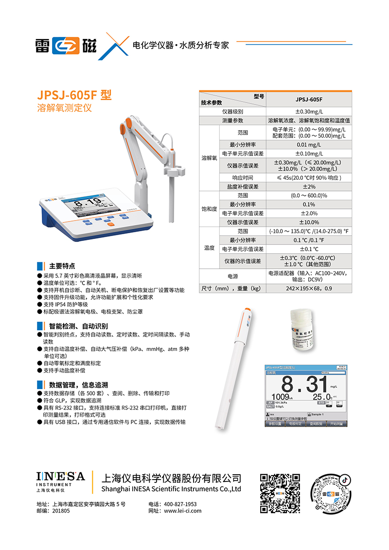 (2)JPSJ-605、JPSJ-605F:探頭測定溶解氧,精度高