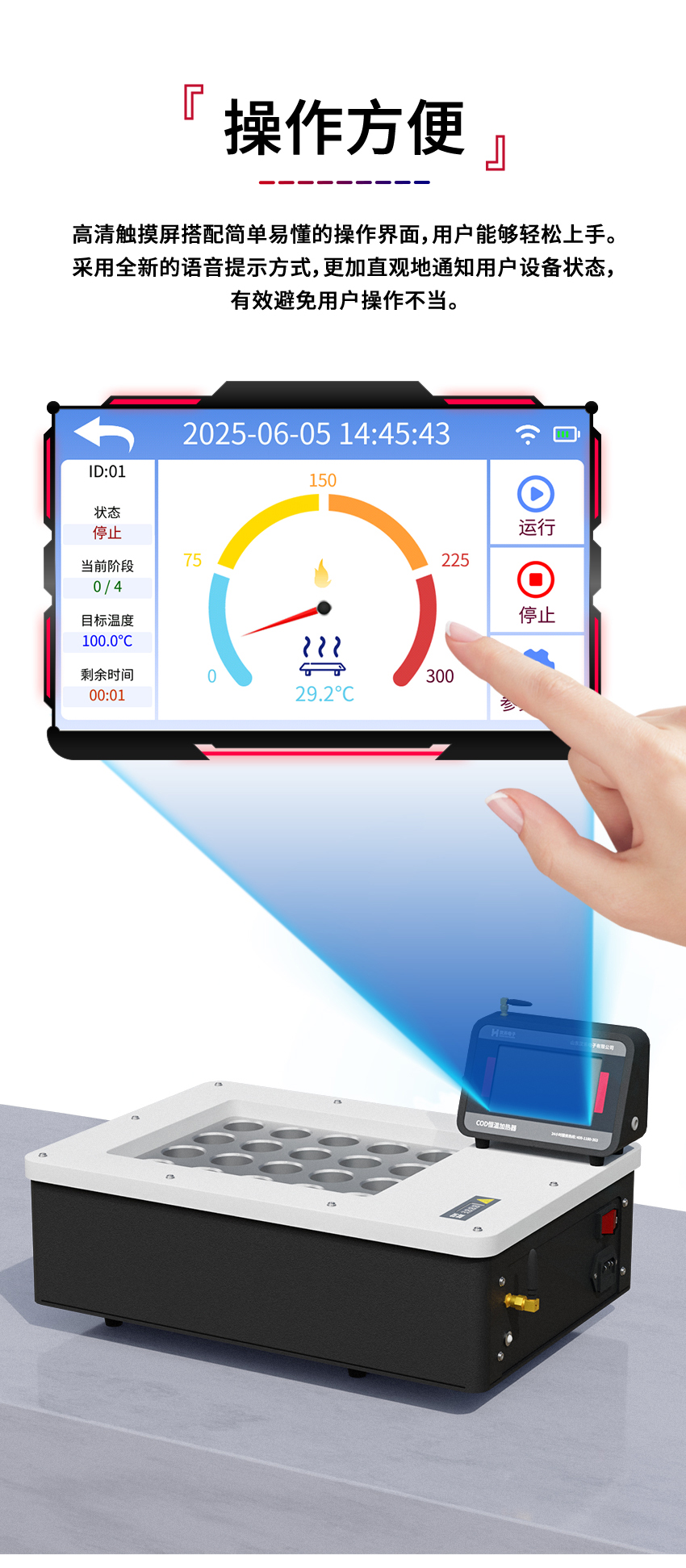 采用高清多色彩全液晶觸摸屏,操作界面簡單易懂,操作方式極具人性化,用戶無需復雜學習即可輕松上手。此外,摒棄傳統蜂鳴器提示方式,改用全新的語音提示,更加直觀地向用戶傳達設備狀態信息,有效避免因用戶操作不當而造成設備損壞。