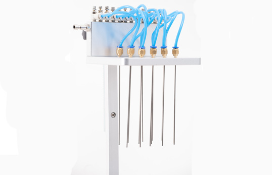 1、分配室上各氣針通道可組合使用或單獨使用,每一路氣針均可單獨開關。分配室的高度可視需要調節。