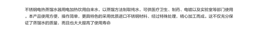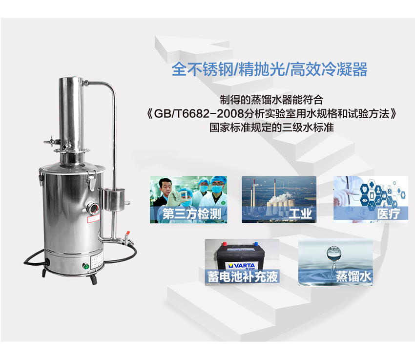 不銹鋼電熱蒸餾水器用電加熱飲用自來水,以蒸餾方法制取純水,可供化工、食品、電鍍以及實驗室等部門使用。本產品使用方便,操作簡單,更具特色的采用優質進口不銹鋼材料、經過特殊處理,精心加工而成。這不僅充分保證了蒸餾水的質量,而且也大大提高了使用壽命。